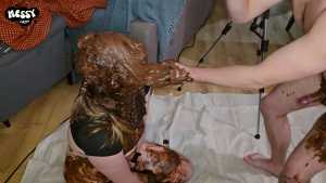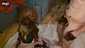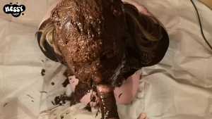 You let me suck it for a while before you trash my face with a handful of chocolate icing, completely covering me. I moan with pleasure as you mess me, and then your cock goes right down my throat again. Another chocolately, slobbery blowjob follows as you keep applying handfuls of the mess to my face.