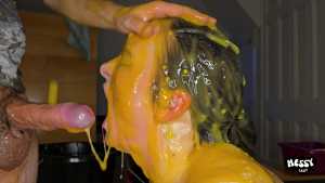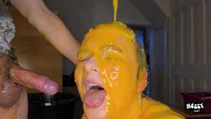 That's not the end. We change positions and come close to the camera so I can suck his thick cock. I take it in my mouth and suck it as he pours more and more custard over my head. I go crazy for it, moaning with pleasure as my face and hair are trashed.